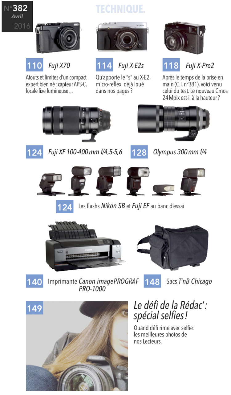 • Tests: les essais du labo et les tests de terrain avec, ce mois-ci, les nouveaux Fuji en vedette. Ils font l'actualité, Chasseur d'Images les a testés au labo et sur le terrain. SOnt-ils vraiment ce qu'on en dit?