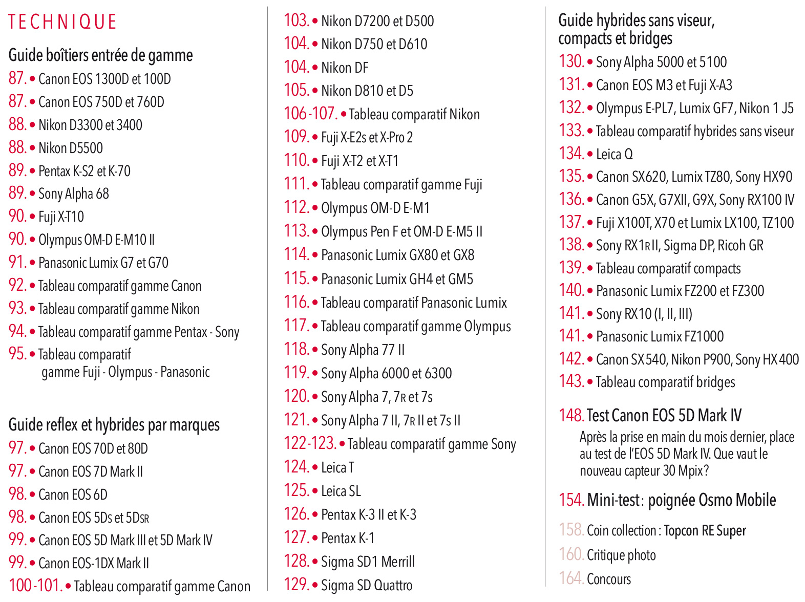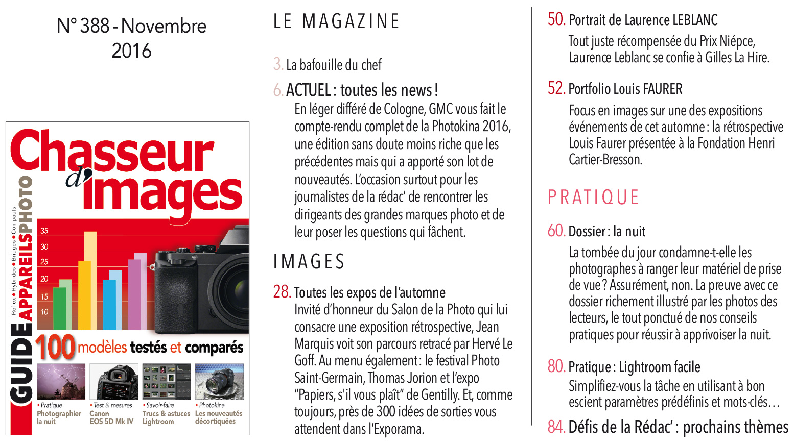 | L'équipe Chasseur d'Images a donc mis les petits tests dans les grands et vous a concocté un numéro spécial sous la forme d'un GUIDE qui présente l'avis de la rédaction sur près de 100 modèles différents, dont les nouveautés de la Photokina! |