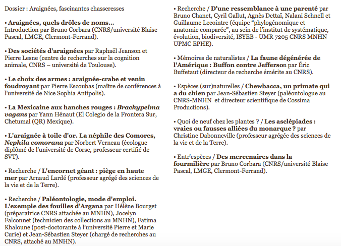 Au sommaire du N°19 : Les araignées : fascinantes chasseresses. Ce n'est pas parce qu'elles n'ont pas bonne presse qu'elles ne méritent pas les honneurs de notre une ! Espèces rend hommage ce trimestre aux bêtes à huit pattes avec un panorama de leurs extraordinaires techniques de chasse : chasse à courre ou à l'affut, la plupart du temps en solitaire mais aussi, dans quelques très rares cas, en meute ! Du Mexique aux Comores, en passant par nos prairies, découvrez la vie secrète des mygales, néphiles ou araignées-crabes, grâce à ceux qu'elles fascinent.