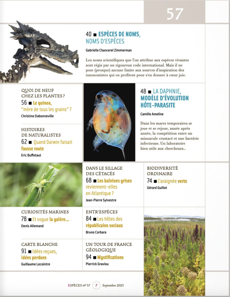 Mais aussi comment le loup est revenu dans les Alpes françaises et si la baleine grise fréquente à nouveau nos côtes ; la course aux armements entre une puce d’eau douce et une bactérie, les superpouvoirs du quinoa, une araignée qui change de couleur au fil des saisons, le flotteur de la galère portugaise, des nids multi-espèces et tout ce que vous n’avez pas compris sur la phylogénie.