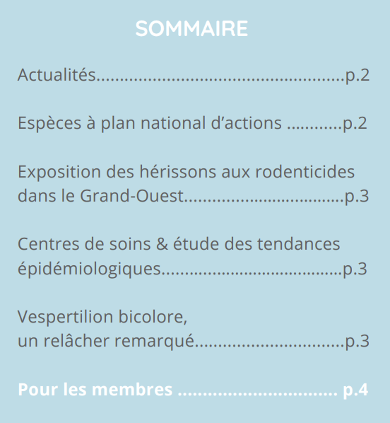 Ce mois-ci, on vous propose une nouvelle rubrique, “Espèces à PNA”, pour mettre en avant la prise en charge des espèces à enjeux dans les centres. On a fait le tour de l’actualité scientifique et on vous a résumé les travaux mettant en avant des collaborations entre chercheurs et centres de soins car OUI, la prise en charge de la faune en détresse sert l’individu mais pas que... Enfin, le contrat de Florian s’achève et nous le remercions pour ce temps passé avec nous mais aussi, entre autre, pour les 4 webinaires qu’il a dédiés aux centres.