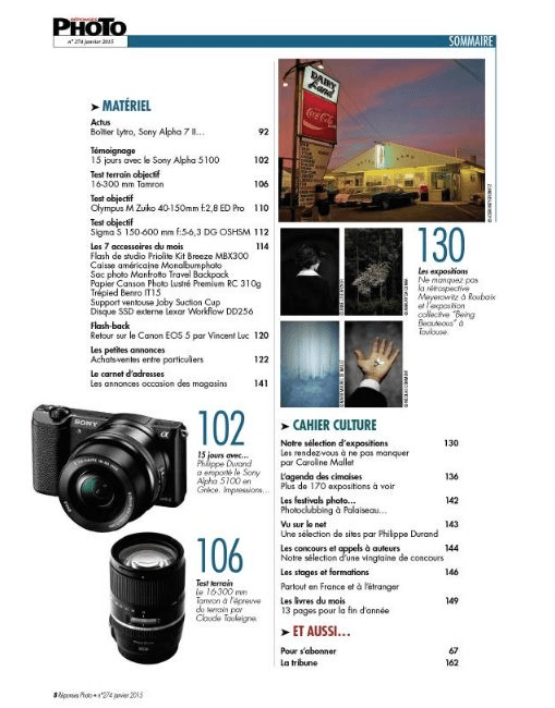 Matériel : les actes, Témoignage : 15 jours avec le Sony Alpha 5100, Test terrain : Tamron 16-300mm, Tests objectifs : Olympus M Zuiko 40-150mm f2,8 ED Pro; Sigma 150-600mm;