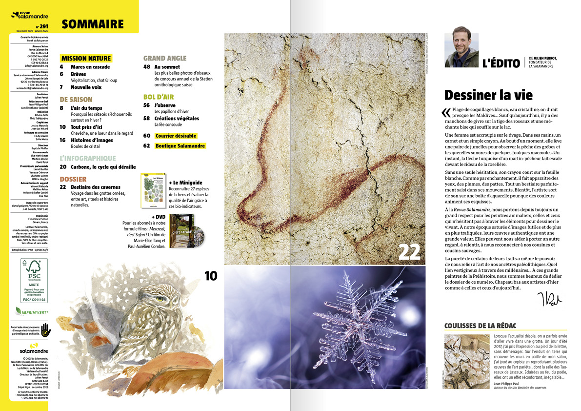 Plage de coquillages blancs, eau cristalline, on dirait presque les Maldives... Sauf qu’aujourd’hui, il y a des manchons de givre sur la tige des roseaux et une mé- chante bise qui souffle sur le lac. Une femme est accroupie sur le rivage. Dans ses mains, un carnet et un simple crayon. Au bout d’un moment, elle lève une paire de jumelles pour observer la pêche des grèbes et les querelles sonores de quelques foulques macroules. Un instant, la flèche turquoise d’un martin-pêcheur fait escale devant le rideau de la roselière. Sans une seule hésitation, son crayon court sur la feuille blanche. Comme par enchantement, il fait apparaître des yeux, des plumes, des pattes. Tout un bestiaire parfaite- ment saisi dans ses mouvements. Bientôt, l’artiste sort de son sac une boîte d’aquarelle pour que des couleurs animent ses esquisses. À la Revue Salamandre, nous portons depuis toujours un grand respect pour les peintres animaliers, celles et ceux qui n’hésitent pas à braver les éléments pour dessiner le vivant. À notre époque saturée d’images futiles et de plus en plus trafiquées, leurs œuvres authentiques ont une grande valeur. Elles peuvent nous aider à porter un autre regard, à ralentir, à nous reconnecter à nos cousines et cousins sauvages. La pureté de certains de leurs traits a même le pouvoir de nous relier à l’art de nos ancêtres paléolithiques. Quel lien vertigineux à travers des millénaires... À ces grands peintres de la Préhistoire, nous sommes heureux de dédier le dossier de ce numéro. Chapeau bas aux artistes d’hier comme à celles et ceux d’aujourd’hui. Julien PERROT, fondateur
