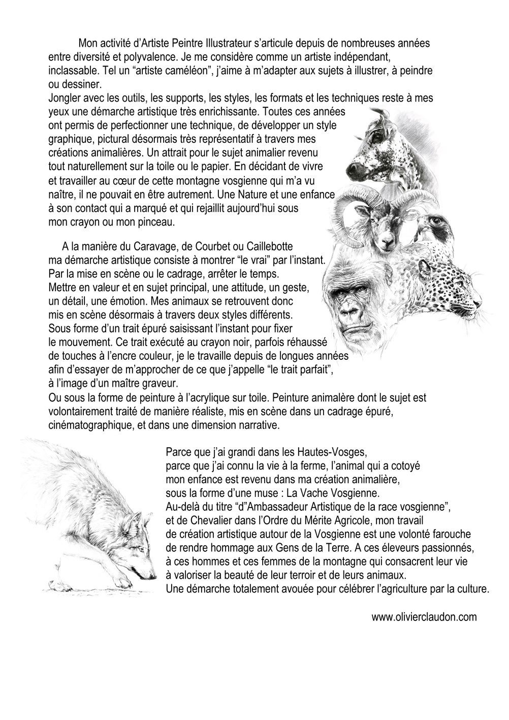 Les souvenirs d’une enfance dans une ferme de montagne au contact de la nature et des animaux ont certainement influencé mon cheminement artistique vers une création de plus en plus animalière. Et bien sûr, mon amour et mon combat pour ma « muse », la vache vosgienne.