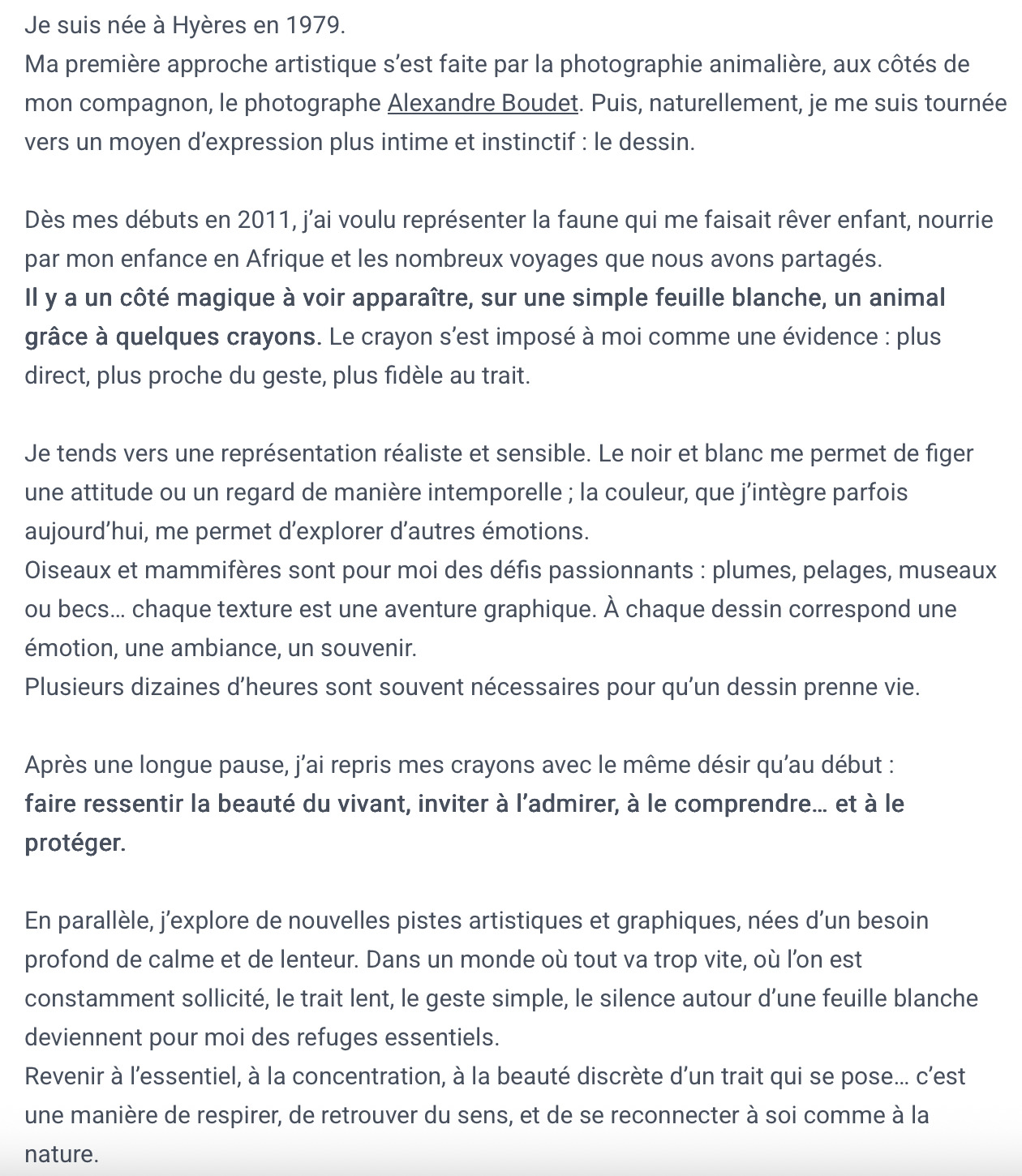 Comme beaucoup, la faune sauvage m’a toujours fascinée. Quand je me suis lancée dans le dessin, c’est tout naturellement que je me suis dirigée vers l’animalier, c’est une catégorie qui m’a toujours attirée alors que les portraits et paysages pas du tout !