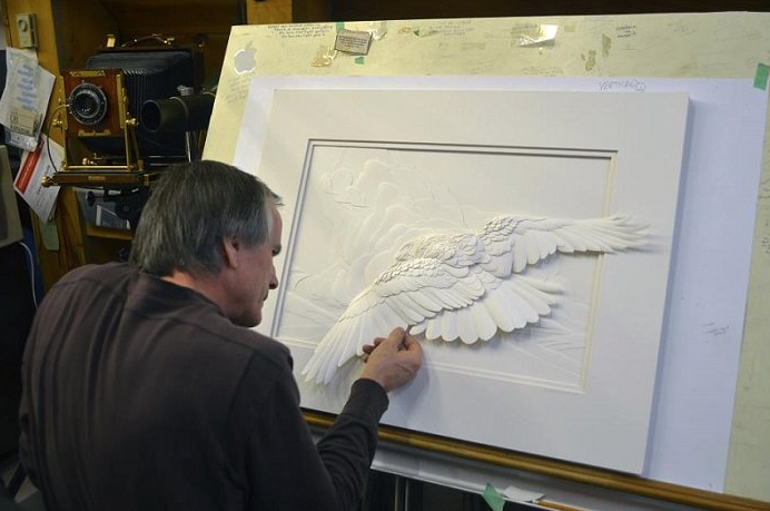 Calvin Nicholls fabrique ces sculptures avec des détails impressionnants juste avec des feuilles de papier et un scalpel. Cela fait 25 ans qu’il pratique son art et le moins que l’on puisse dire, c’est qu’il est passé maître dans l’art de transformer de simples feuilles… en oeuvres pleines de vie tout simplement magnifiques.