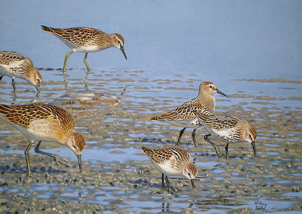 Dominic Mitchell, Managing Director of Birdwatch sais: "Szabi's work, entitled 'We are all young', is a captivating study of juvenile waders at close quarters featuring Ruff, Dunlin, Little Stint and Pectoral Sandpiper. It provides a bird's-eye view in feather-by-feather detail, the artist having perfectly captured the character, posture and plumage of the featured species. All the judges were impressed with the composition and excecution of the work and felt that Szabi Kókay was a worthy winner."