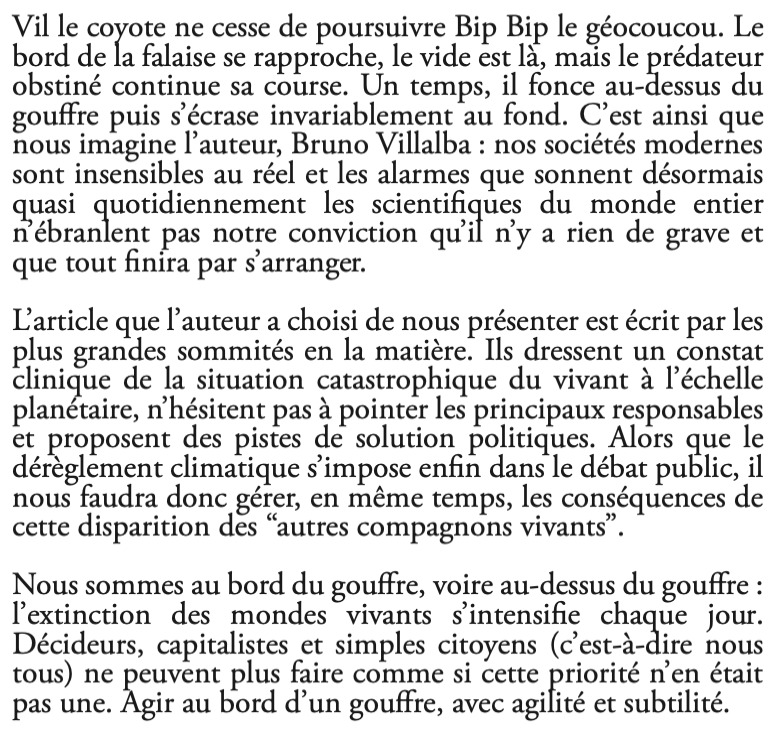 Plus personne ne peut désormais ignorer le maillage étroit qui nous unit avec les autres compagnons terrestres. À partir de l’analyse du texte de Rodolfo Dirzo, Gerardo Ceballos et Paul R. Ehrlich. “Au bord du gouffre : la crise de l’extinction et le futur de l’humanité”, le chercheur en écologie politique Bruno Villalba propose de suivre l’entremêlement des causes historiques de la destruction des mondes vivants et des conséquences présentes et à venir. Plus urgente encore que la crise climatique, cette extinction de masse révèle notre extrême dépendance à toutes ces espèces vivantes que nous considérons encore comme secondaires dans notre projet humain. Notre responsabilité est d’imaginer, maintenant, un monde commun car, comme le rappellent Dirzo, Ceballos et Ehrlich : “Les êtres humains font partie de la biodiversité.” Une partie parmi d’autres.