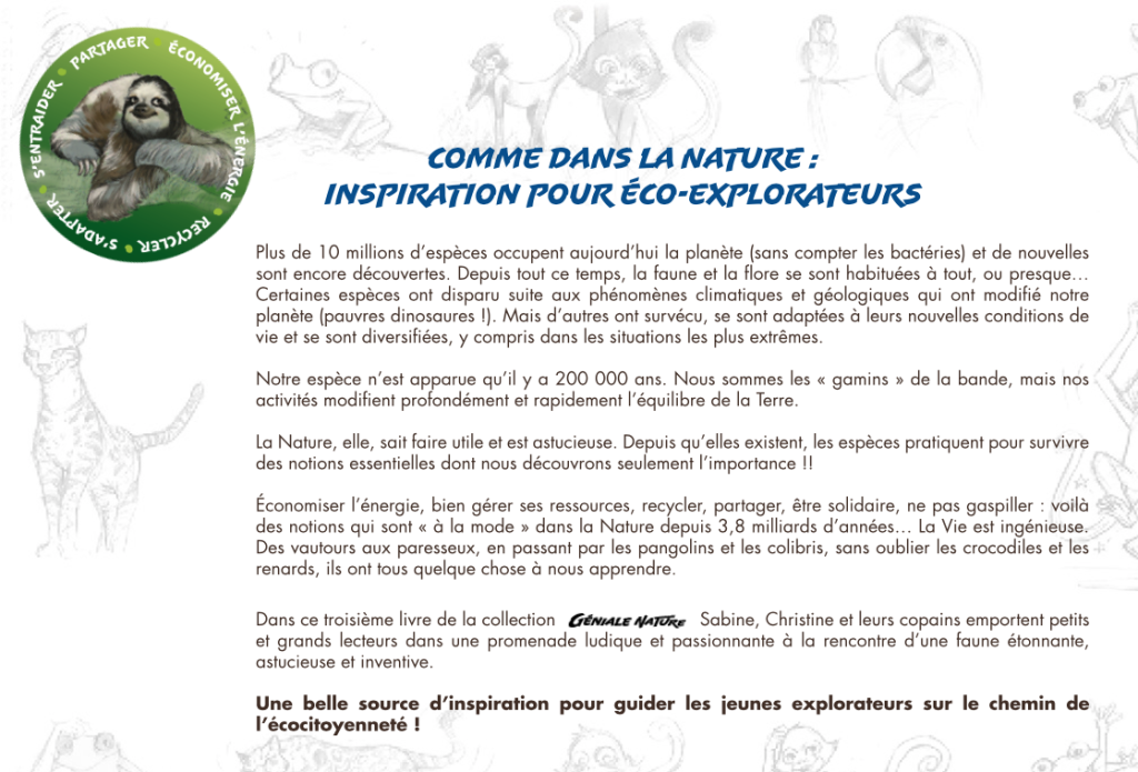 Sabine Bernert, Christine Denis-Huotet leurs copains emportent petits et grands lecteurs dans une promenade ludique, optimiste et passionnante à la rencontre d'une faune étonnante, astucieuse et inventive : une belle source d'inspiration pour guider les jeunes explorateurs sur le chemin de l'écocitoyenneté !