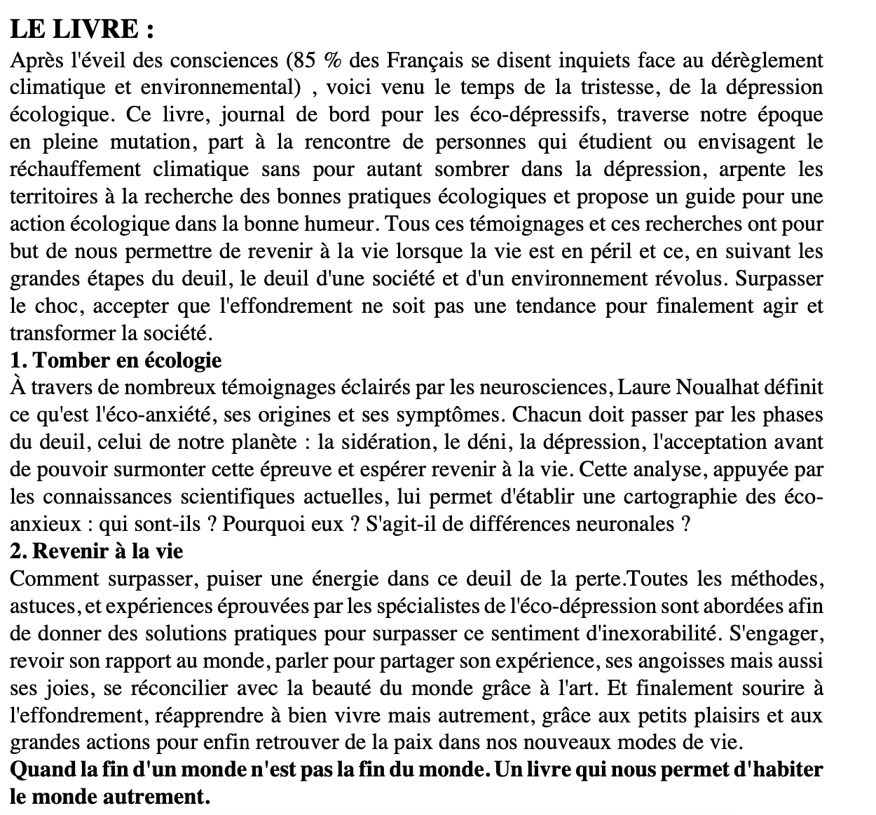 L'auteure : Journaliste à Libération durant quinze ans, Laure Noualhat explore sans relâche les limites de ce monde fini et contribue aujourd’hui à la revue Yggdrasil et au mensuel Siné. Elle a participé à de nombreux documentaires (dont Après Demain, coréalisé avec Cyril Dion, PMA : le meilleur des mondes ? coréalisé avec Jean Crépu, ou Sécurité nucléaire : le grand mensonge, un docu-enquête réalisé avec Éric Guéret). Elle incarne également Bridget Kyoto, qui sévit sur YouTube depuis 2010 via de séditieuses « minutes nécessaires » écrites par Éric La Blanche. Vingt ans plus tard, elle est toujours debout, ce qui fait d’elle le fil d’Ariane parfait pour cheminer dans l’écodépression.