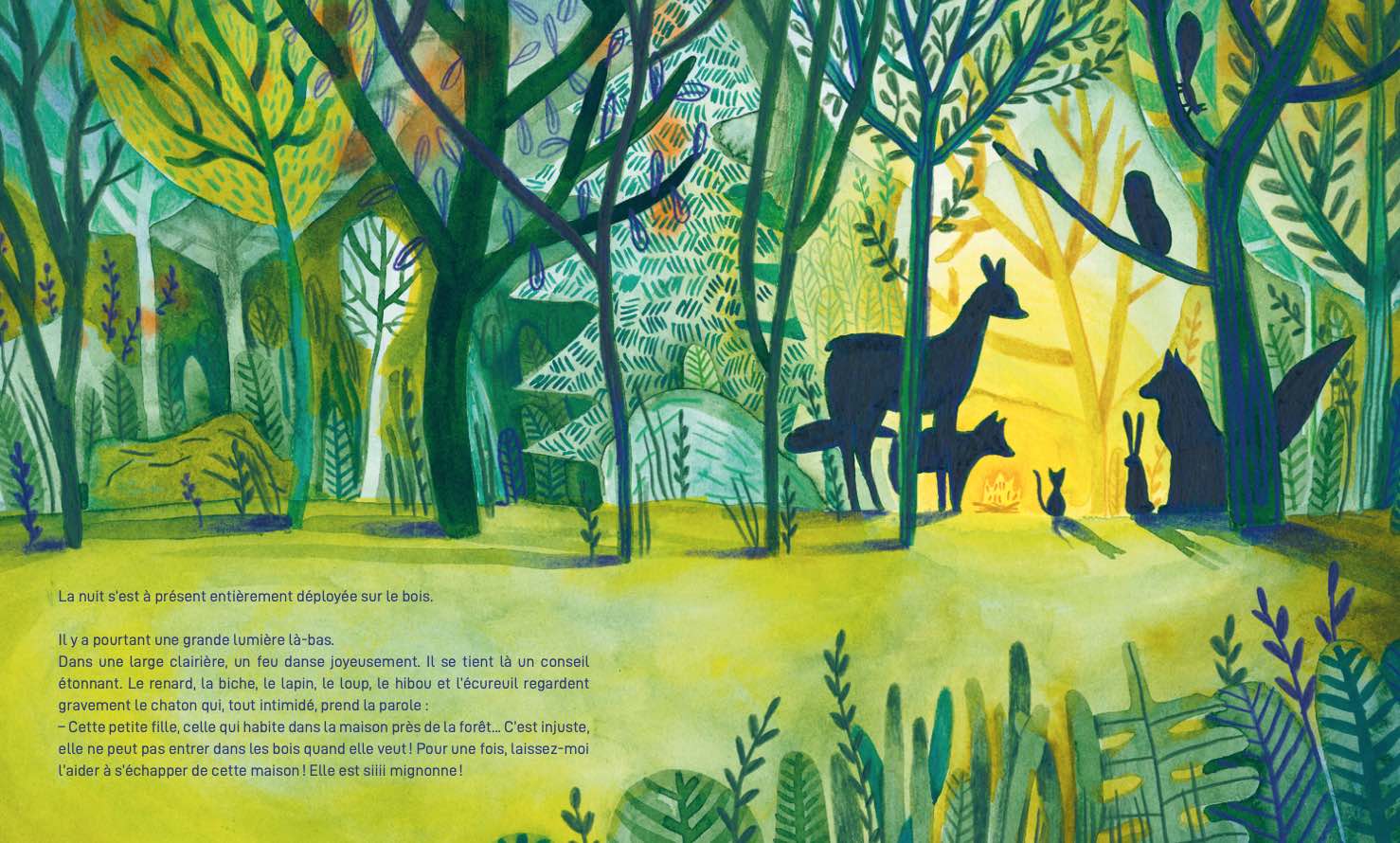 Alors qu’Alice rencontre un adorable petit chat sauvage, il est malheureusement déjà l’heure d’aller se coucher. Accompagné des animaux de la forêt, le chaton va aider Alice à s’évader de sa chambre pour lui faire découvrir les mystères de la nuit. Elle escalade alors les arbres avec l’écureuil, dégringole les talus à la suite du loup, embrasse la lune et, surtout, respire la nuit. Puis c’est au tour du chaton d’entrevoir l’univers d’Alice, d’être cajolé, porté de bras en bras, jusqu’au soir où, tous les deux vont finalement se coucher, comblés de sensations nouvelles pour nourrir leurs rêves. En inversant les rôles - le chaton mignon veut ramener l’enfant chez lui - Maylis Daufresne accompagne les enfants dans la découverte d’une nuit sans peurs et enchantée par le plaisir de dévoiler les secrets de la nuit. Un album gai et mystérieux, où l’univers coloré de Magali Dulain illumine l’ombre et où l’on embrasse l’inconnu avec bonheur.