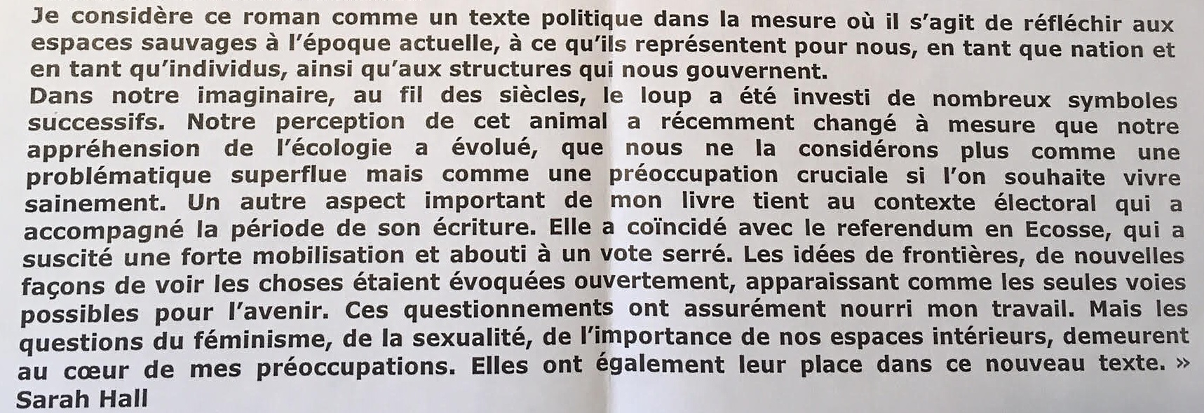 Sur fond de débat sur l’indépendance de l’Ecosse, Sarah Hall interroge la nature fondamentale de l’homme et de l’animal, se penche sur les concepts d’écologie et de progrès, sur les dangers qui pèsent sur l'environnement rural moderne, sur les préoccupations les plus obsédantes de l'humanité. Ceci à travers une galerie de personnages que Sarah Hall campe avec empathie. mais les loups - tantôt visibles tantôt non, car ils vont et viennent dans le monde réel comme dans celui des rêves - sont incontestablement le clou du spectacle.