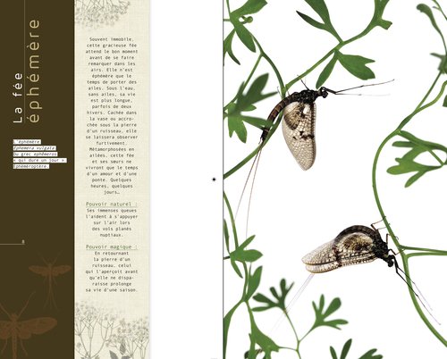 Photographiées de façon poétique et féérique, ces "fées" sont présentées ici de façon encyclopédique et faussement sérieuse, avec de vraies infos sur leur vie d'insectes et des infos imaginaires sur leur vie de fées.