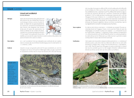 214 espèces d'amphibiens et de reptiles d’Europe (85 amphibiens et 129 reptiles) sont présentés. Les 155 notices descriptives, plus ou moins longues selon l'importance des espèces (fréquence, répartition), sont accompagnées de nombreuses photos et cartes. Pour éviter les répétitions, les espèces étroitement apparentées dont la morphologie et la biologie diffèrent à peine sont traitées ensemble.