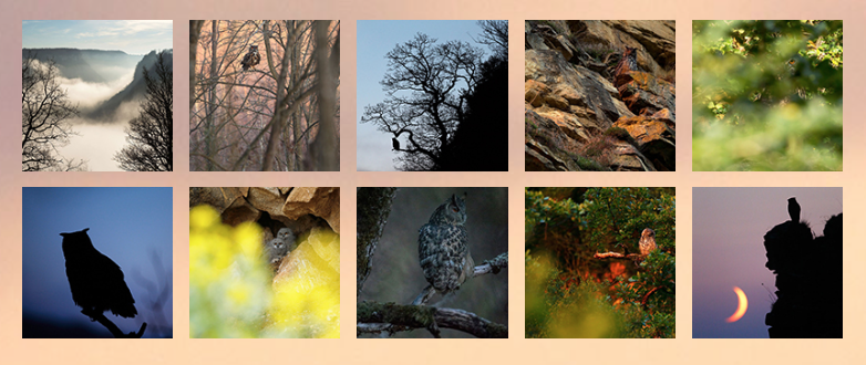 Le hibou grand-duc, un oiseau mythique, a toujours fasciné les hommes. Vénéré, craint, il ne laisse jamais indifférent. J’ai la chance de vivre dans le Jura où il habille les falaises et les reculées sauvages de sa présence discrète. En véritable sentinelle, le hibou grand-duc passe ses journées à l’abri des regards dans une cavité rocheuse façonnée par le temps où il ne dort que d’un œil, le moindre mouvement est immédiatement repéré.