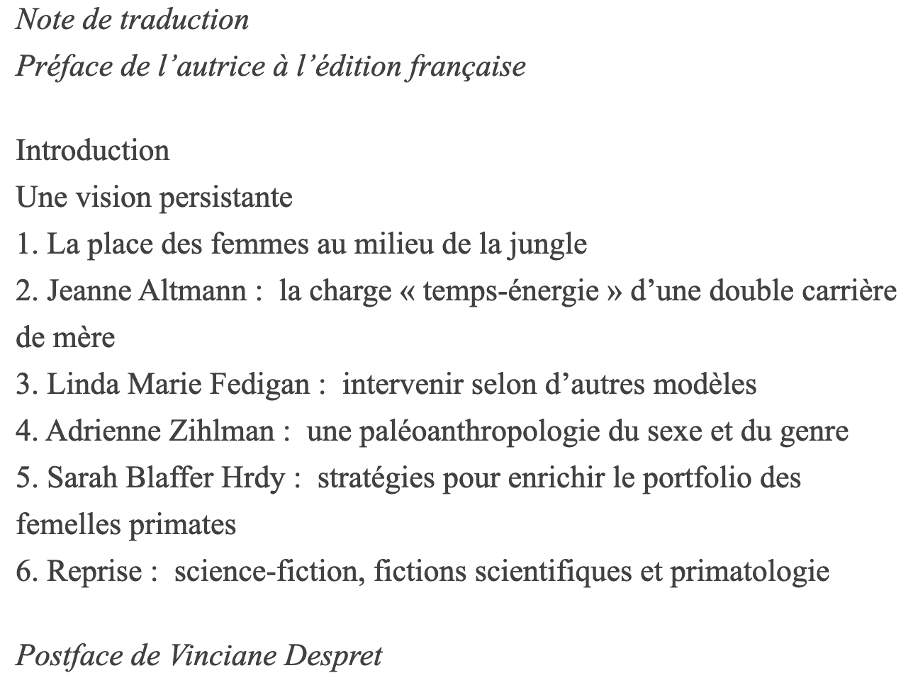 Être femelle offre une galerie de portraits de femmes primatologues (elles aussi primates) qui ont amené à des renversements profonds de perspective sur les singes – sur leurs ­comportements et sur leurs relations sociales.