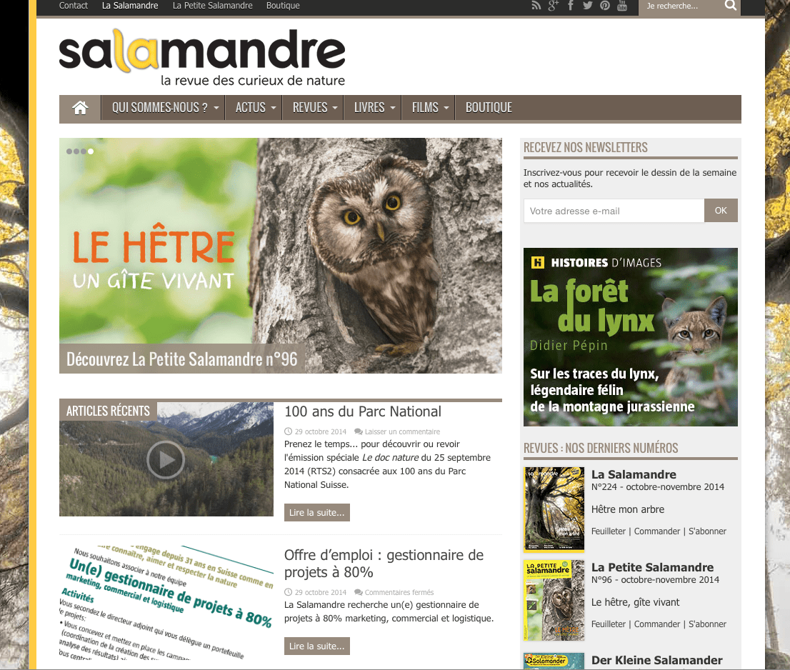 Fondée en 1983 par Julien Perrot, jeune naturaliste alors âgé de 11 ans, La Salamandre est d’abord une revue qui propose tous les deux mois de découvrir la nature qui vit et pétille tout autour de chez vous. La sensibilité des textes, la richesse des nombreuses illustrations, la qualité des photos et de l’impression et enfin l’absence de pages de publicité font aujourd’hui de la «revue des curieux de nature» une référence forte de 26’000 abonnés aux quatre coins de Suisse romande et dans toute la France.
