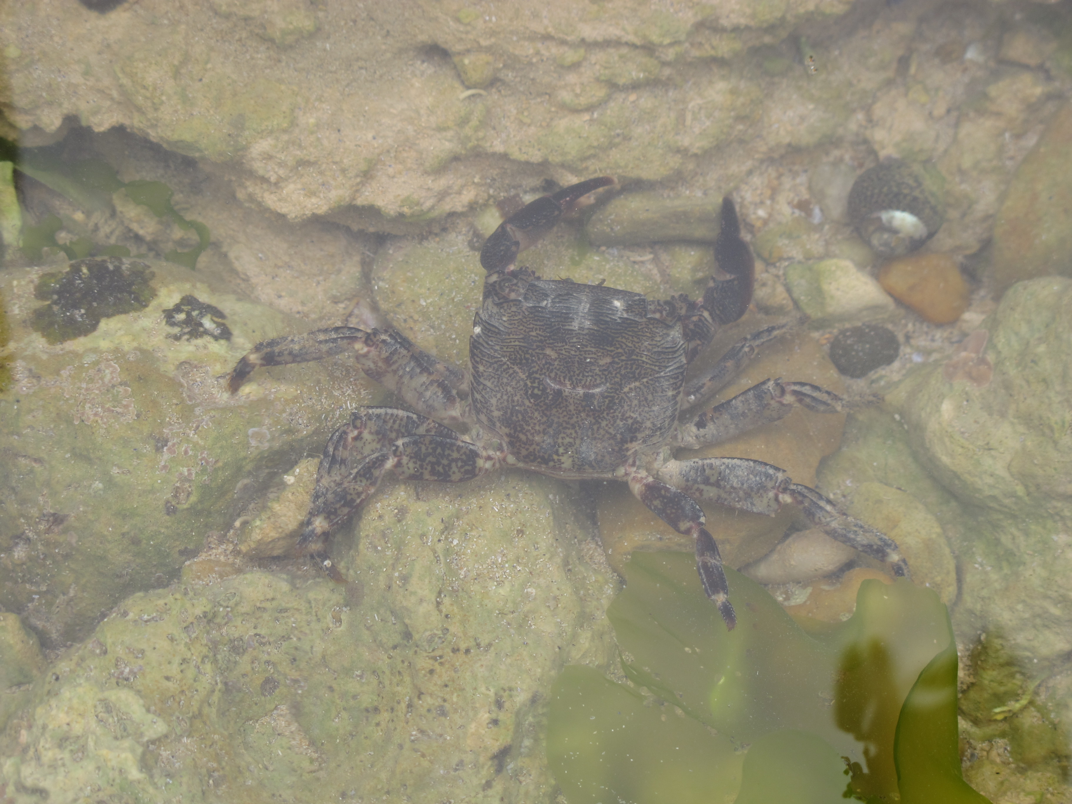 Sous les rochers, des crabes - marbré, vert ou enragé, Porcelane, bras de fer ou Xantho...; étoiles de mer,  Ophiures, crevettes et bouquets, anémones en fleurs, oursins...