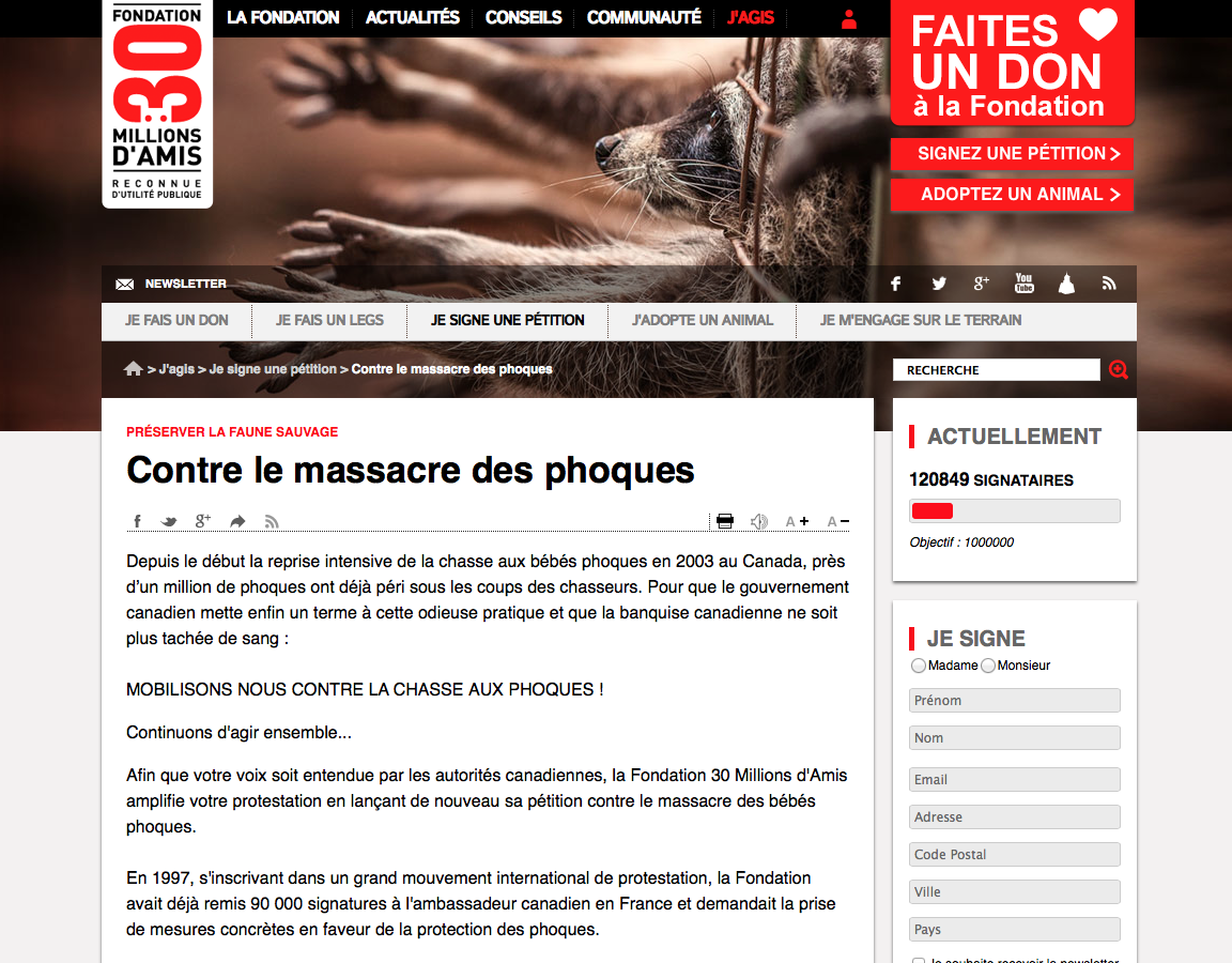Depuis le début la reprise intensive de la chasse aux bébés phoques en 2003 au Canada, près d’un million de phoques ont déjà péri sous les coups des chasseurs. Pour que le gouvernement canadien mette enfin un terme à cette odieuse pratique et que la banquise canadienne ne soit plus tachée de sang.