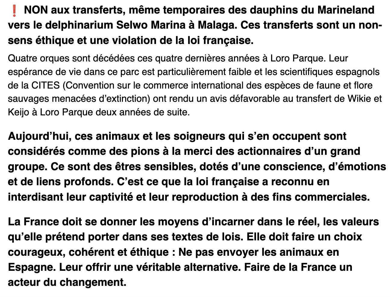 Cinq ans d’inertie politique amènent aujourd’hui l’État à envisager l’inacceptable : les transferts des cétacés vers des delphinariums en Espagne, notamment vers Selwo Marina pour les dauphins et Loro Parque pour les orques. Un tel scénario serait en violation directe de la loi française et reviendrait à exporter et prolonger ailleurs la souffrance qu’il a été convenu d’interdire en France. En réalité, pour les animaux, les conditions de vie seraient même pires que ce qu’ils ont connu jusqu’à présent. Il est aberrant que la mise en application d’une loi pour le bien-être animal aboutisse à plus de souffrances et de traumatismes pour les animaux concernés. Nous, citoyens, demandons à l’État français de refuser catégoriquement ces transferts.