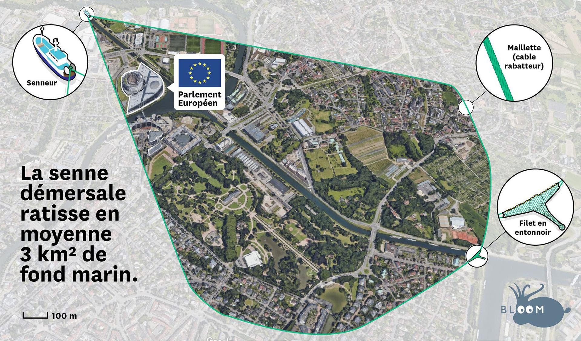 La senne démersale consiste à déployer un câble sur les fonds marins en formant un polygone couvrant une surface gigantesque de 3 km² afin de capturer tous les poissons piégés à l’intérieur du mur de sédiments soulevés par les câbles. [4]