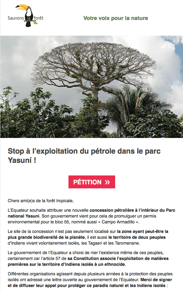 L’Equateur veut attribuer une nouvelle concession pétrolière à l’intérieur du Parc Yasuni. Le territoire concerné abrite la peut-être plus grande biodiversité de la planète ainsi que des peuples volontairement isolés. Signez notre pétition pour empêcher l’exploitation du pétrole dans le bloc 55 !