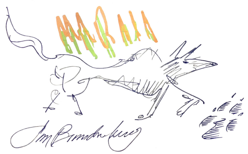 Lors d'une rencontre à Montier, il nous avait offert ce dessin, symbolisant le statut du loup à travers le monde, "sujet brûlant"