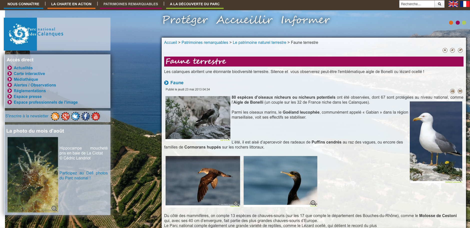 Les Calanques offrent une biodiversité remarquable avec 140 espèces terrestres animales et végétales protégées, 60 espèces marines patrimoniales et un patrimoine culture d'une très grande richesse.