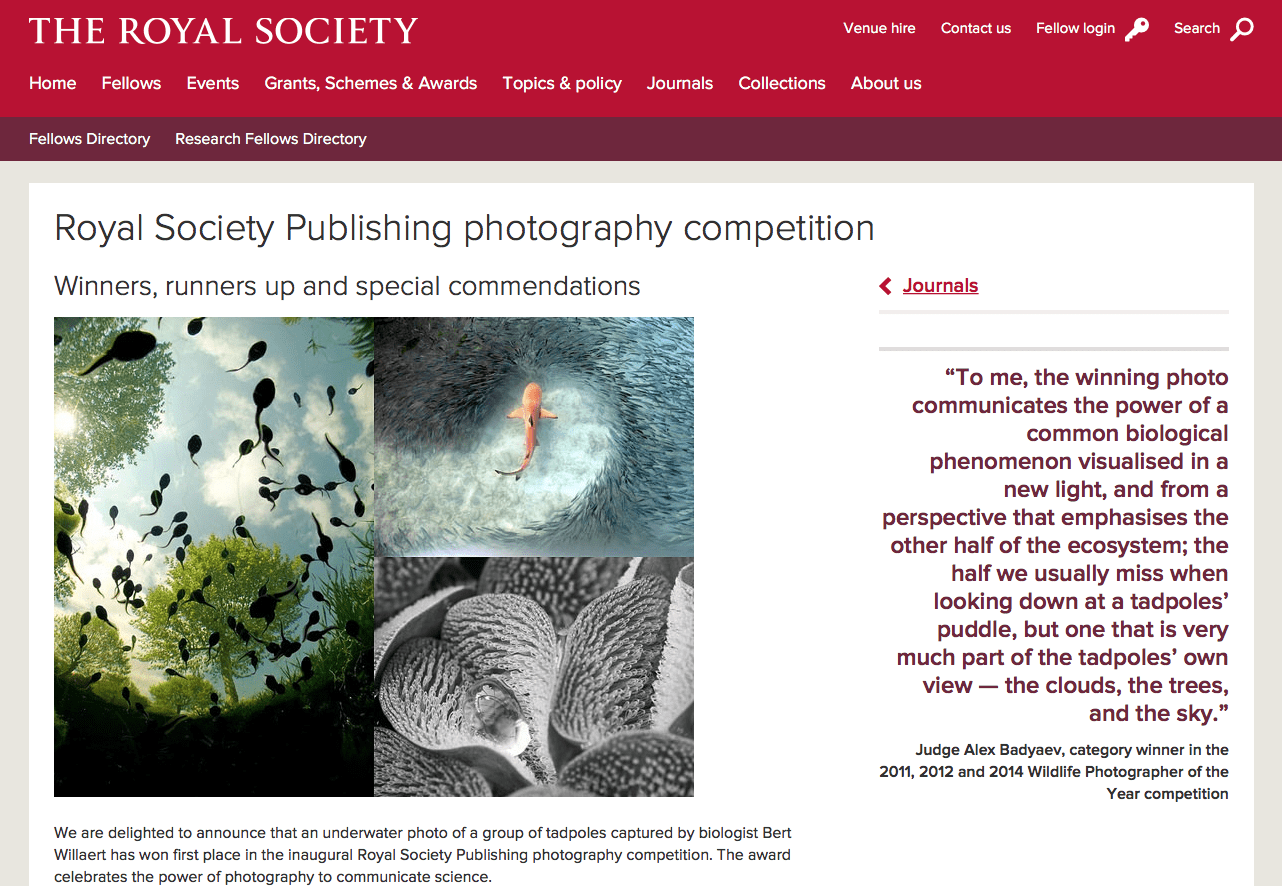 Cette célèbre et vénérable institution Anglaise, qui se targue d'être la plus ancienne académie scientifique en activité, vient d'organiser pour la première fois de son histoire un concours photographe, dont voici les gagnants