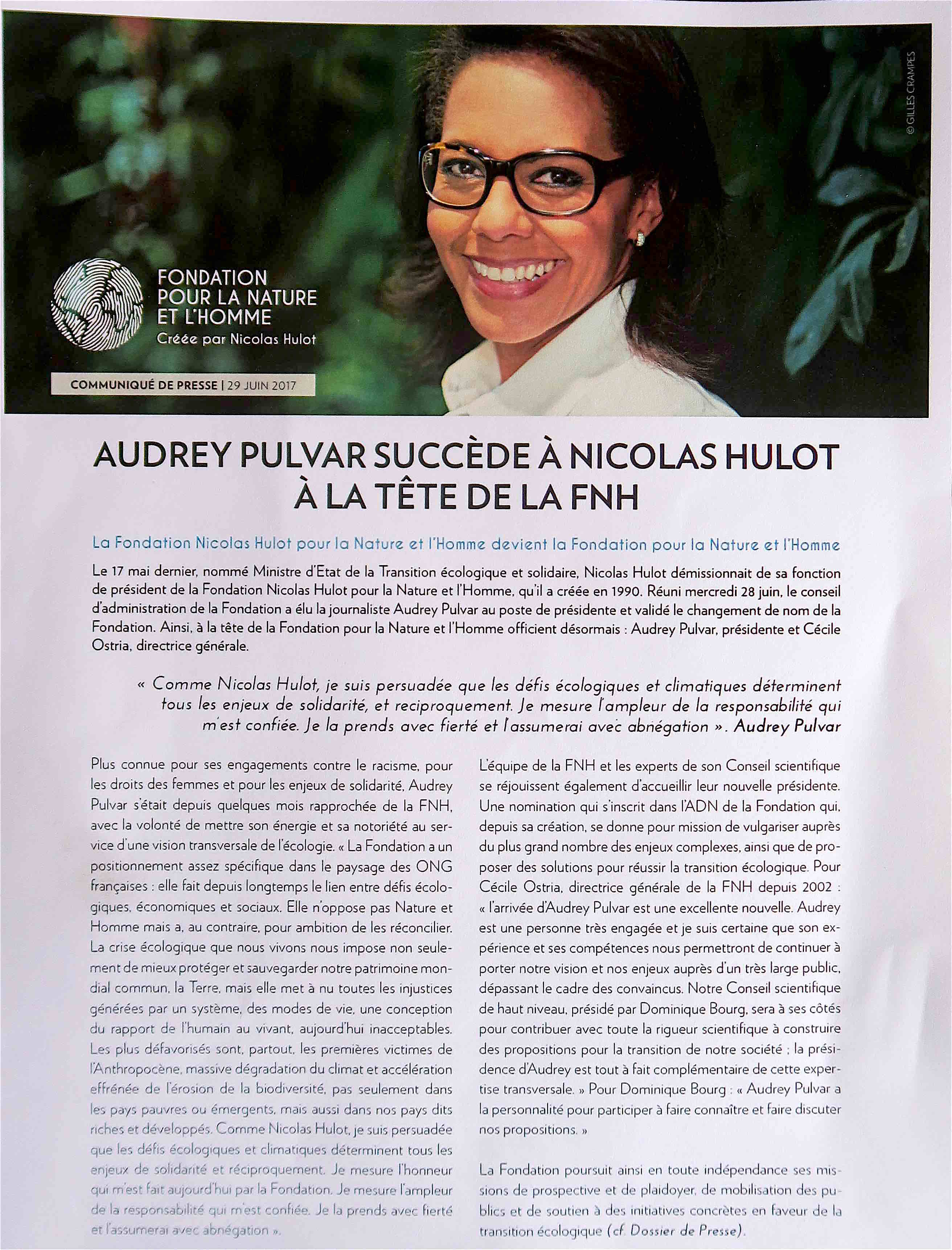 Soutenue par la direction de la Fondation, sa directrice générale, Cécile Ostria, ses équipes, son Conseil d'Administration, son Comité de donateurs et par le conseil scientifique présidé par Dominique Bourg, Audrey Pulvar commence sa mission qu'elle "prend avec fierté et assumera avec abnégation"
