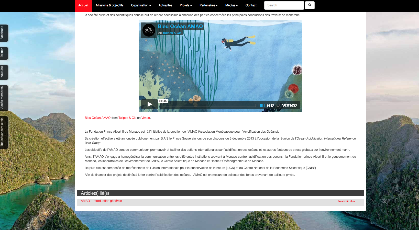 L’acidification des océans est un des impacts majeurs de l’augmentation du niveau de gaz carbonique dans l’atmosphère dus aux émissions de gaz à effet de serre. Depuis la déclaration de Monaco sur l’acidification des océans signée par 150 scientifiques de 26 pays en 2008, le Prince Albert II de Monaco et Sa Fondation sont très actifs sur cette thématique majeure qui sera notamment abordée lors de la Conférence des Nations Unies sur le changement climatique (COP 21, Paris 2015).