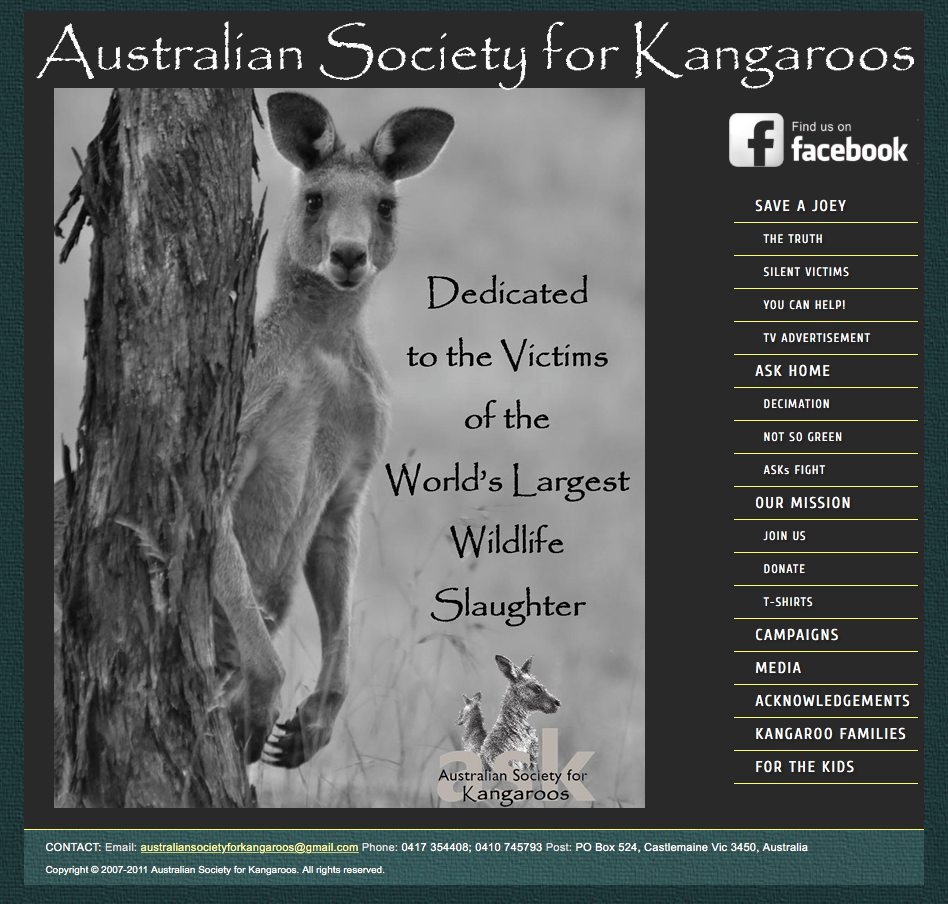 The Australian Society for Kangaroos endeavors to educate the public about the plight of kangaroos and wallabies across Australia as victims of the world's largest land-based wildlife massacre, and dispel the misconceptions that have led to their ongoing destruction and persecution in Australia.