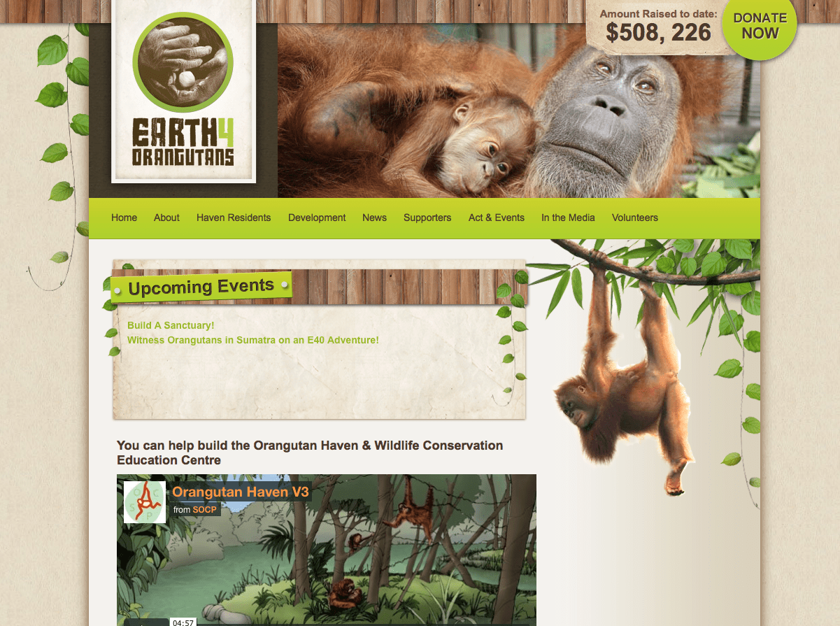 Earth 4 Orangutans is an international fundraising and awareness campaign to support The Orangutan Haven and Wildlife Conservation Centre. The Orangutan Haven and Wildlife Conservation Education Centre will be the first of its kind. Its development will achieve a number of important conservation goals vital for a more positive and sustainable future for Northern Sumatra's people, wildlife and environment