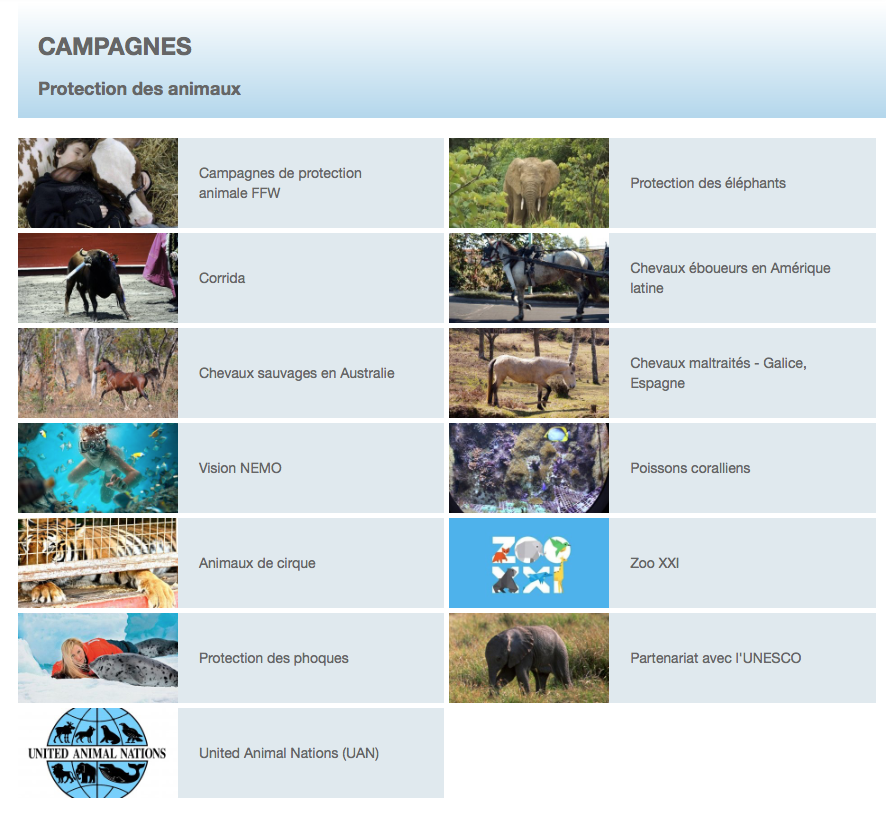 Des projets concrets, comme la création et la gestion de réserves naturelles, le dépôt d’initiatives populaires ou d’actions en justice, aboutissent régulièrement à d’extraordinaires victoires pour notre planète. Qu’il s’agisse des éléphants d’Afrique, des bébés phoques au Canada, des chevaux sauvages en Australie, ou de paysages magnifiques, la FFW cherche inlassablement à démontrer que la nature et ses beautés, la faune et la vie n’appartiennent pas à un seul pays mais à l’humanité tout entière.
