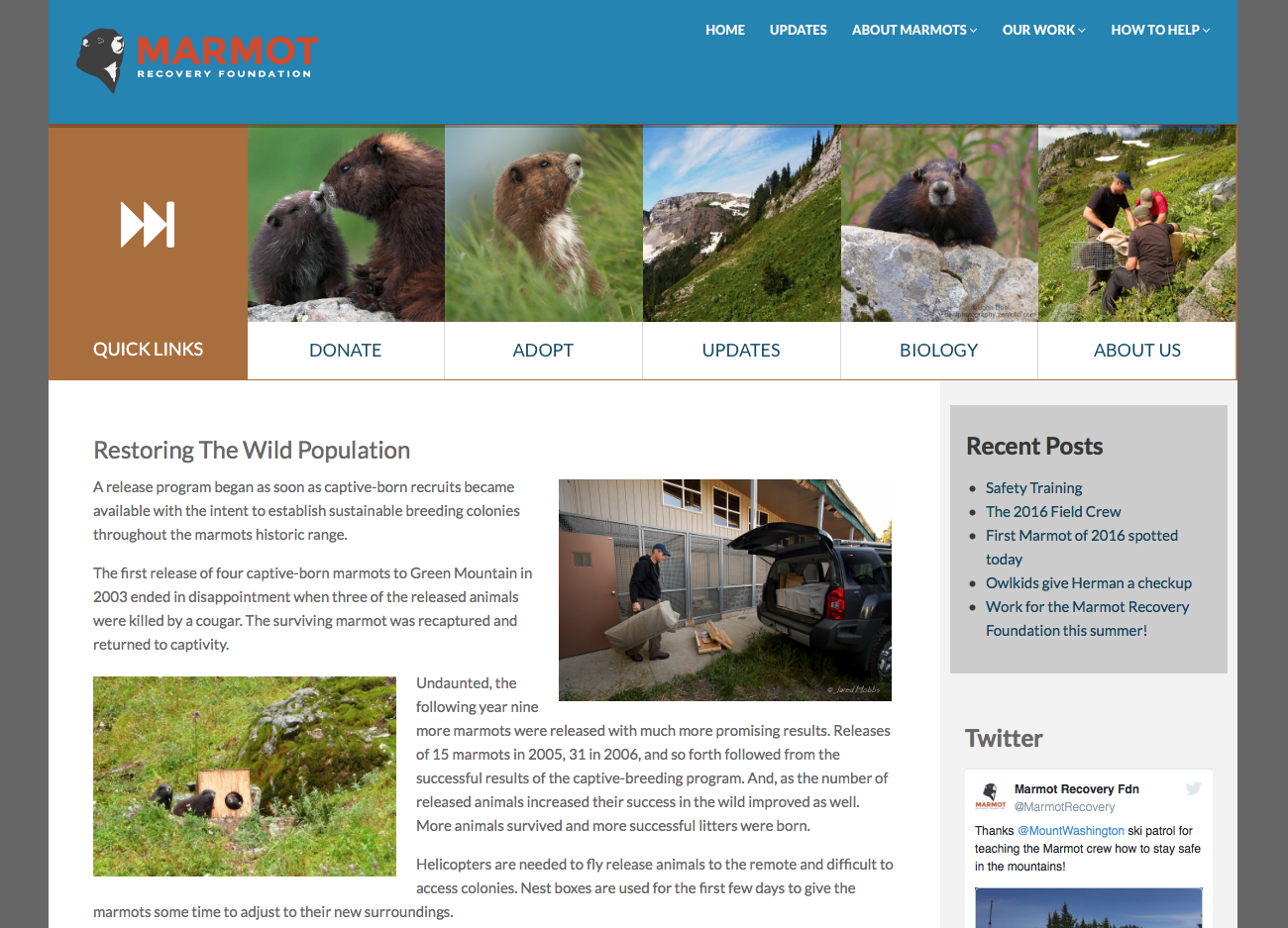 Cette association Canadienne tente de sauver de l'extinction la marmotte de l'ïle de Vancouver (Marmota vancouverensis) qui est présente uniquement sur quelques flancs de collines abruptes de l'Ile de Vancouver (Canada).