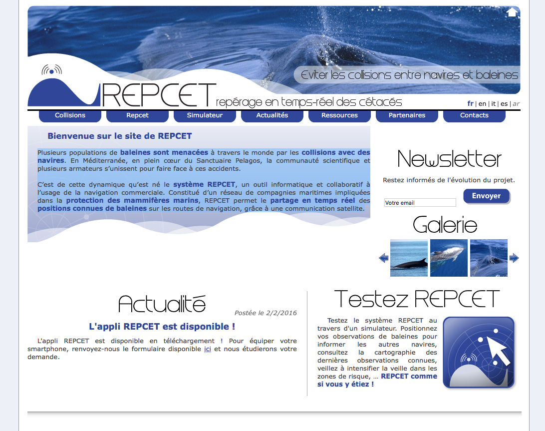 C’est de cette dynamique qu’est né le système REPCET, un outil informatique et collaboratif à l’usage de la navigation commerciale. Constitué d’un réseau de compagnies maritimes impliquées dans la protection des mammifères marins, REPCET permet le partage en temps réel des positions connues de baleines sur les routes de navigation, grâce à une communication satellite.