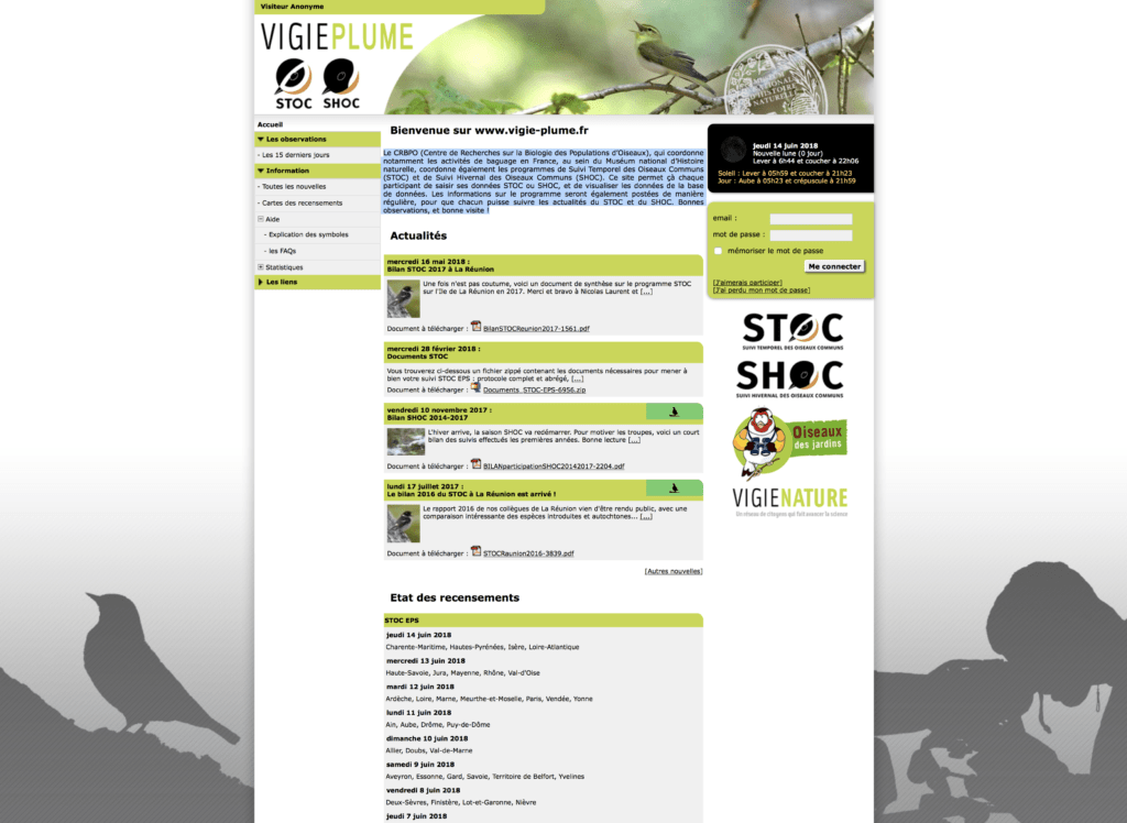 Le CRBPO (Centre de Recherches sur la Biologie des Populations d’Oiseaux), qui coordonne notamment les activités de baguage en France, au sein du Muséum national d’Histoire naturelle, coordonne également les programmes de Suivi Temporel des Oiseaux Communs (STOC) et de Suivi Hivernal des Oiseaux Communs (SHOC).