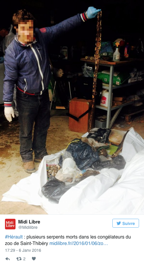 Des photos publiées par Le Midi-Libre montrent des dépouilles de bêtes dans des sacs poubelles. La plupart sont des serpents, mais on évoque également des carcasses de singes, un bébé zébu et des perroquets arlequins, qui seraient eux empaillés.