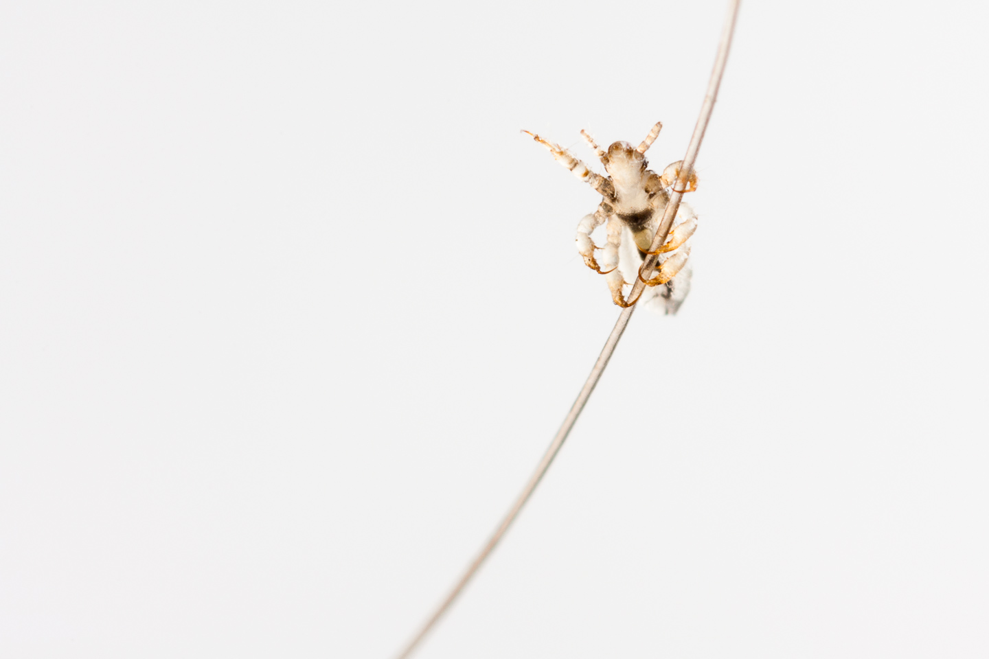 Larve de pou [Pediculus humanus capitis] sur son support capillaire, macrophotographie (rapport 3.5:1). Photo primée (prix Macro et gros plan-Grand Ouest) au concours Festimages Nature 2012.