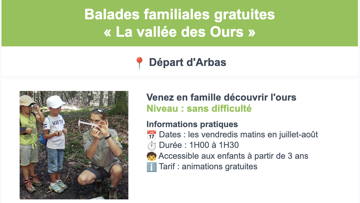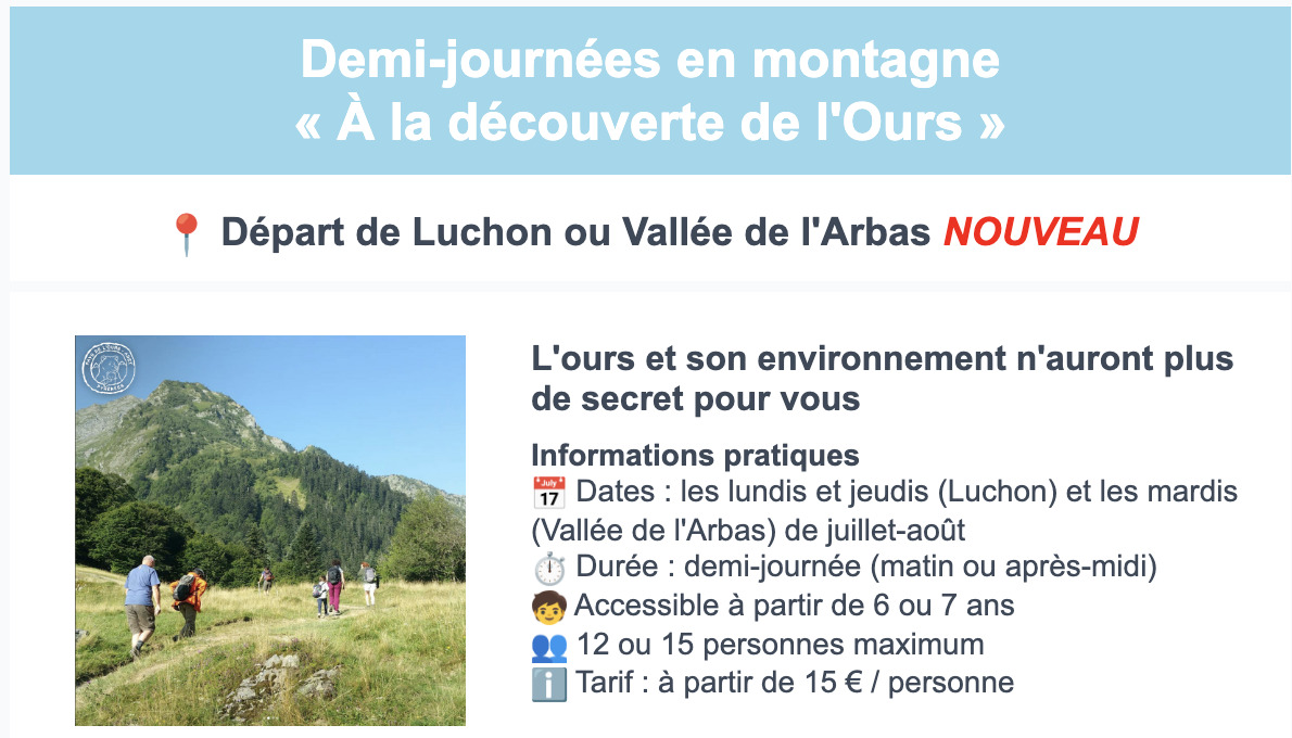 Cet été, nous proposons plus de 60 sorties « les nôtres » !C’est plus du double de l’année dernière,dont une nouvelle dans la Vallée de l’Arbas.De la balade familiale à la randonnée à la journée, il y en a pour tous les publics !Toutes nos sorties sont encadrées par un(e) animateur(trice) spécialisé(e) ou par un accompagnateur en montagne, membre du Réseau Ours Brun.N’hésitez pas à nous contacter si vous souhaitez participer à une sortie : contact@paysdelours.com