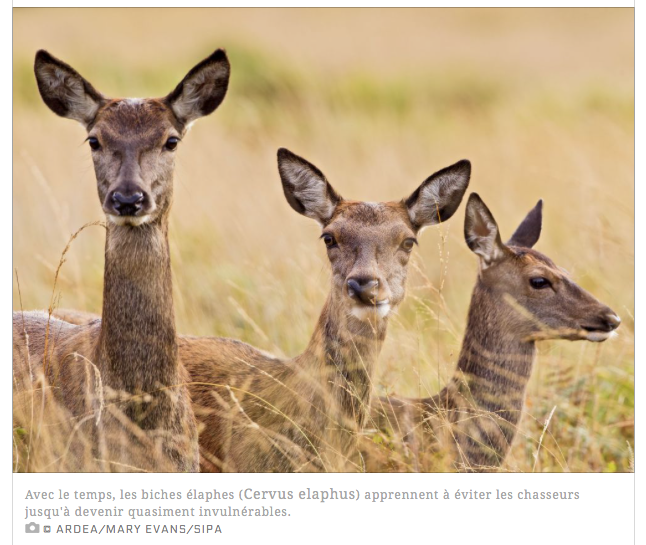 L’humain est loin d’être le seul animal qui gagne de l’expérience avec le temps. D’autres espèces, comme par exemple le cerf élaphe (Cervus elaphus), élaborent des stratégies tout au long de leur vie bien souvent pour réussir à échapper aux dangers qui les guettent. Selon une étude publiée le 14 juin 2017 dans PlosOne, les femelles de l’espèce précédemment citée apprennent à éviter les chasseurs avec l’âge. Elles sont si efficaces qu’elles « deviennent pratiquement invulnérables aux chasseurs quand elles atteignent l’âge de 9/ 10 ans, indique l’étude. Ce qui confirme que l’expérience contribue à leur survie« . (…)