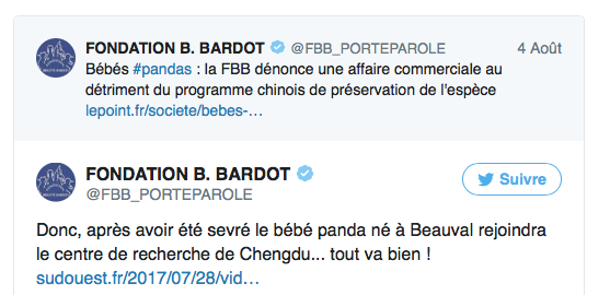« En Chine, il existe des programmes de conservation du panda qui auraient pu faire bien davantage pour l’espèce, en bénéficiant directement, des millions d’euros brassés dans cette campagne franco-chinoise de communication », estime la Fondation Brigitte Bardot de défense des animaux, rappelant que les pandas géants sont sur la liste rouge mondiale des espèces menacées établie par l’Union internationale pour la conservation de la nature (UICN).