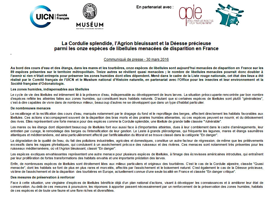 Au bord des cours d’eau et des étangs, dans les mares et les tourbières, onze espèces de libellules sont aujourd’hui menacées de disparition en France sur les 89 espèces présentes sur le territoire métropolitain. Treize autres se révèlent quasi menacées ; le nombre de libellules menacées pourrait donc doubler à l’avenir si rien n’était entrepris pour préserver les zones humides dont elles dépendent. Mené dans le cadre de la Liste rouge nationale, cet état des lieux a été réalisé par le Comité français de l’UICN et le Muséum national d’Histoire naturelle, en partenariat avec l’Office pour les insectes et leur environnement et la Société française d’Odonatologie.uicn