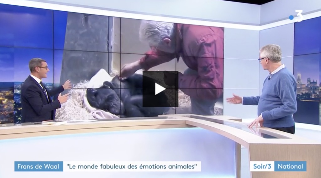 Les animaux ont « les mêmes émotions que les nôtres. Les expressions faciales des chimpanzés sont très similaires aux nôtres. Nous sommes des animaux. Les similarités sont là : le cerveau, le corps, les muscles dans le visage. Nous sommes des primates et on se comporte comme des primates. Tous les mammifères ont des émotions communes : colère, réconciliation, attachement, domination », rappelle le primatologue néerlandais dans le Soir 3, mardi 20 novembre.