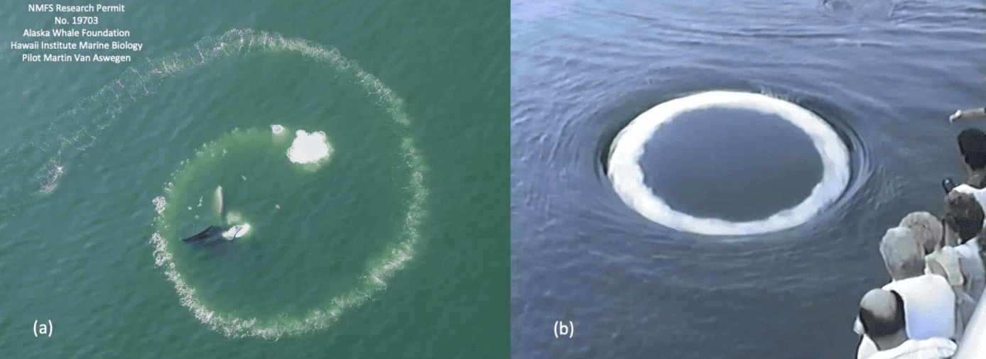 Les cétacés sont bien connus pour leur maîtrise des bulles sous-marines, notamment grâce à leur événement d’où ils expulsent l’air. Ainsi, ces bulles peuvent servir à éloigner un rival ou chasser, à l’image des filets de bulle formant une spirale parfaite de Fibonacci créée par la collaboration de plusieurs baleines à bosse. L’une des techniques de chasse les plus remarquables et ingénieuses du monde animal.