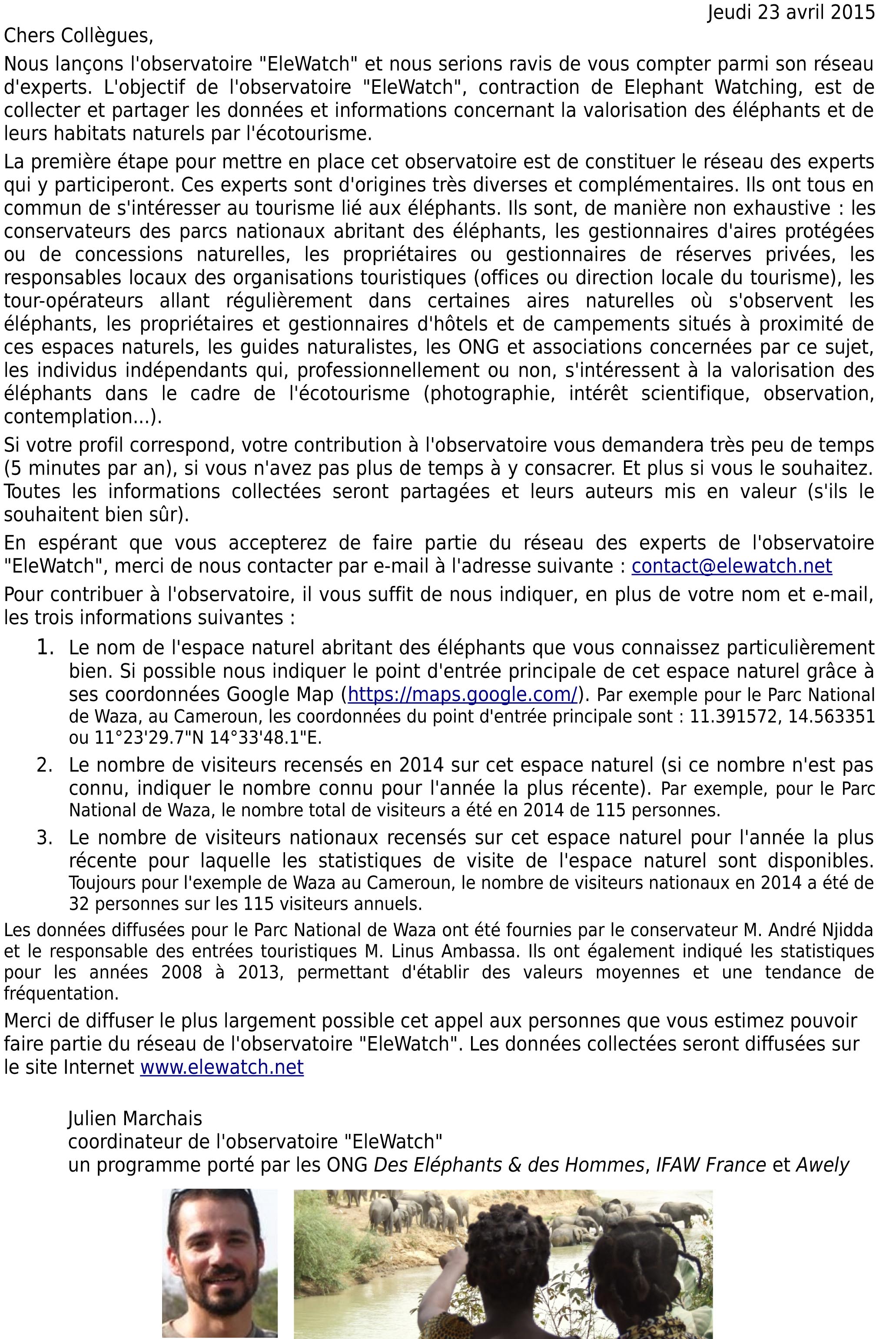Les ONG Des Eléphants &t Des Hommes, Awely et IFAW lancent l’observatoire « EleWatch » (pour Elephant Watching), dont le but est de collecter et partager les données et informations concernant la valorisation des éléphants et de leurs habitats naturels par l’écotourisme.
