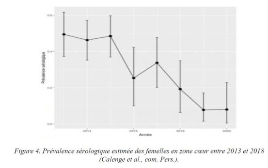 A force de dézinguer tous les bouquetins, le taux de prévalence de la brucellose a inévitablement chuté. Il s’établit aux alentours de 10% en 2019-2020 dans le cœur de massif, pour les femelles.