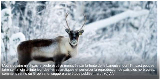 L’ours polaire n’est pas la seule espèce menacée par la fonte de la banquise, dont l’impact peut se faire sentir loin à l’intérieur des terres arctiques et perturber la reproduction de paisibles herbivores, comme le renne du Groenland, suggère une étude.