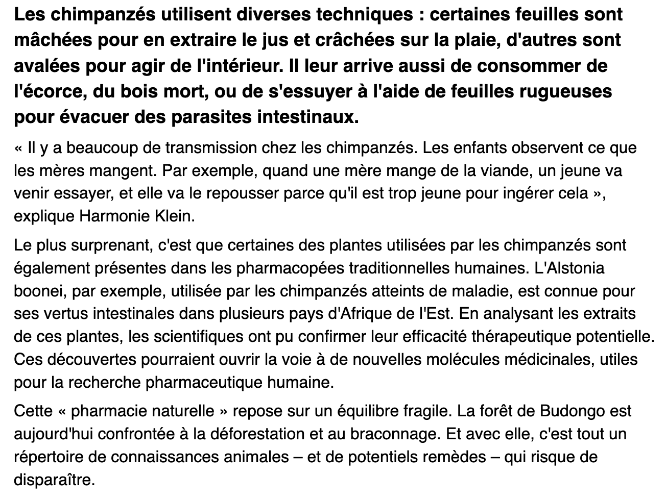 « C’est assez impressionnant de voir qu’ils ont une connaissance des propriétés de certaines plantes qu’ils mangent et qu’ils arrivent à comprendre quand un autre individu a besoin d’aide », explique Harmonie Klein, primatologue à l’université de St Andrews, en Écosse, pour La Relève et La Peste.