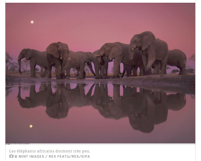 Les éléphants africains (Loxodonta africana) dans la nature ne dorment en moyenne que deux heures par jour et restent régulièrement éveillés pendant près de 48 heures, ce qui fait d’eux les mammifères les plus insomniaques, selon une étude parue mercredi 1er mars 2017 dans la revue PLOS one (…)